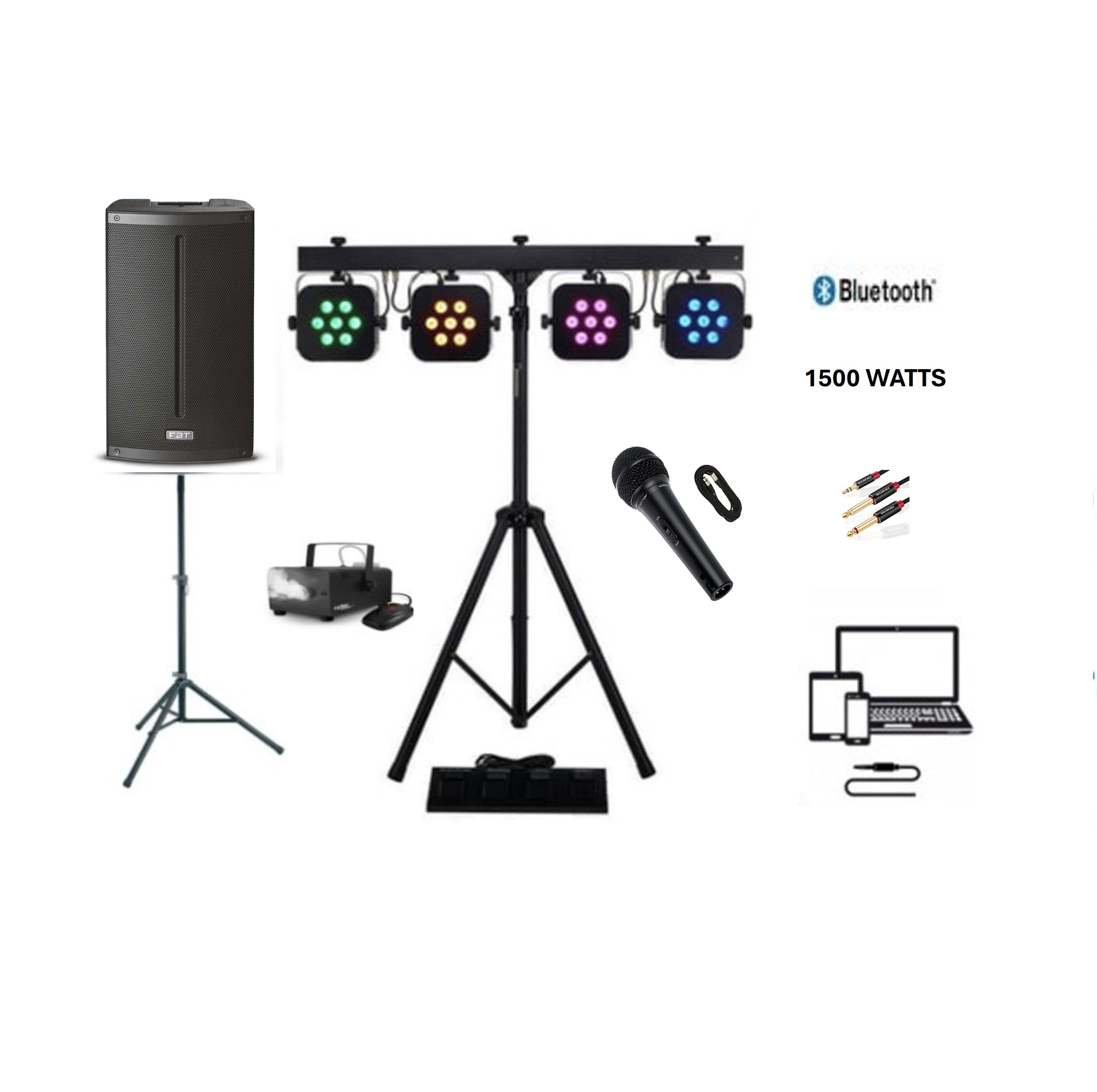 Ce pack de sonorisation complet vous offre 1500 watts de puissance, un jeu de lumière dynamique, un micro filaire professionnel et une machine à fumée pour créer une ambiance unique et immersive.